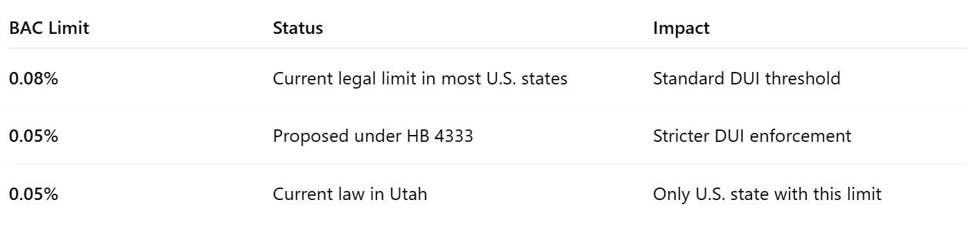 Currently, drivers in Illinois are considered legally impaired when their BAC reaches 0.08% or higher. HB 4333 proposes lowering this threshold to 0.05%, meaning drivers could face DUI charges with a smaller amount of alcohol in their system.